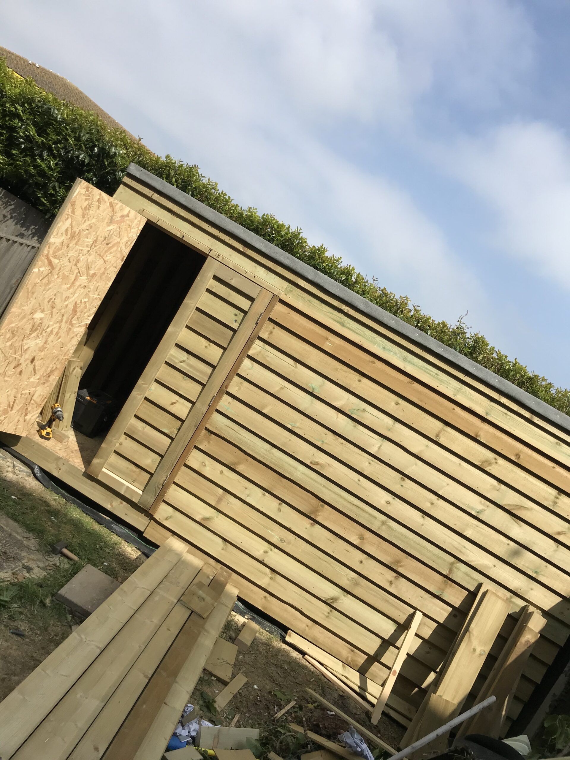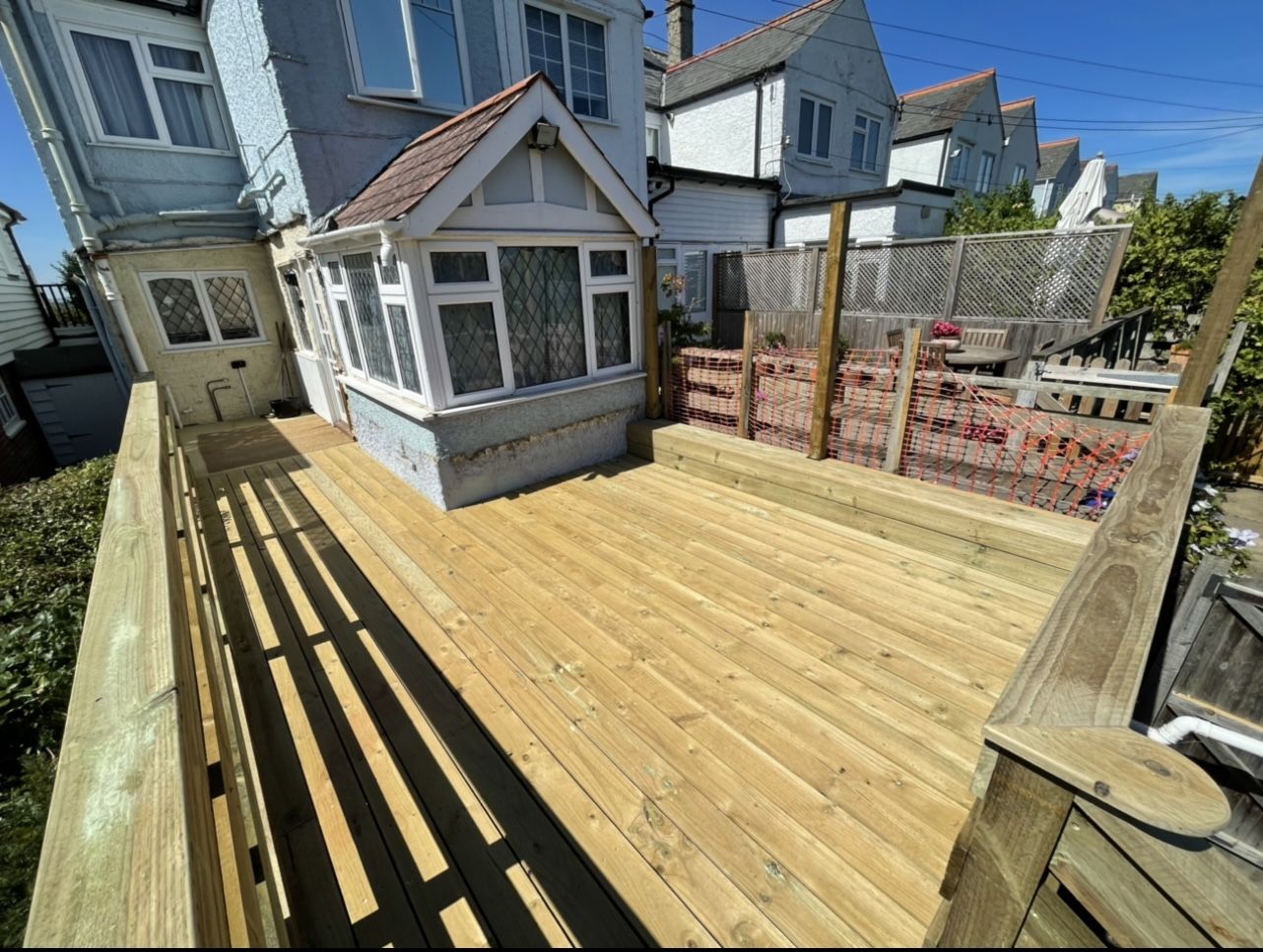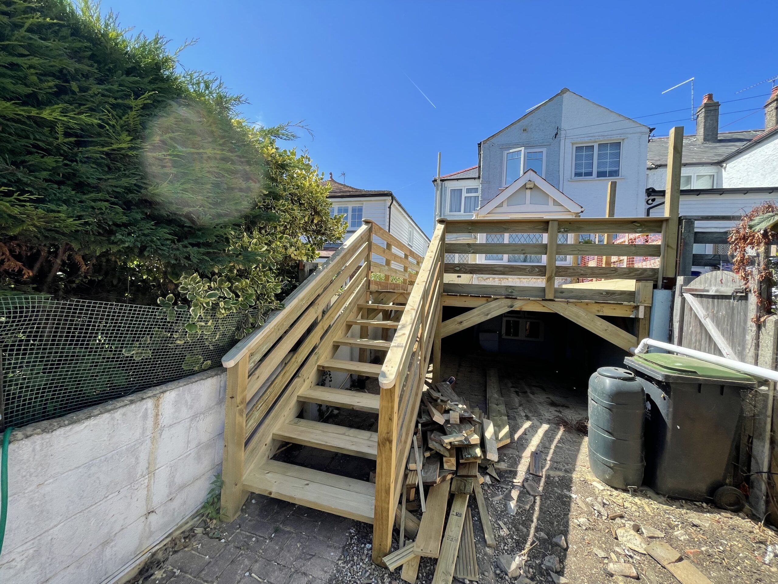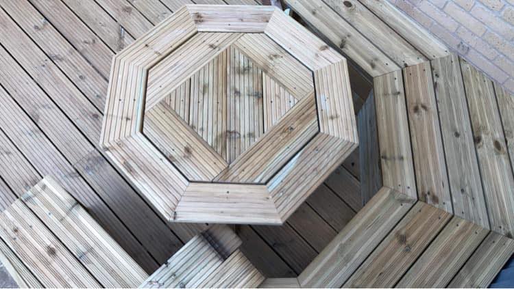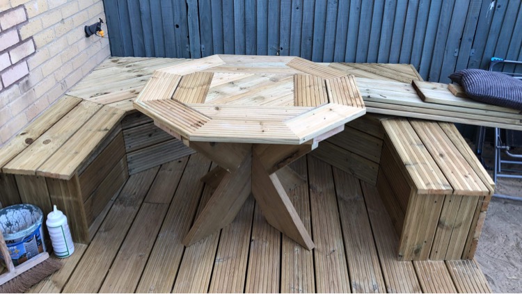 A decking area complete with a sturdy set of stairs built on site A bespoke timber frame shed we built on site, finished with a softwood shiplap cladding A bench and table we built on top of this decking to create a enclosed seating area